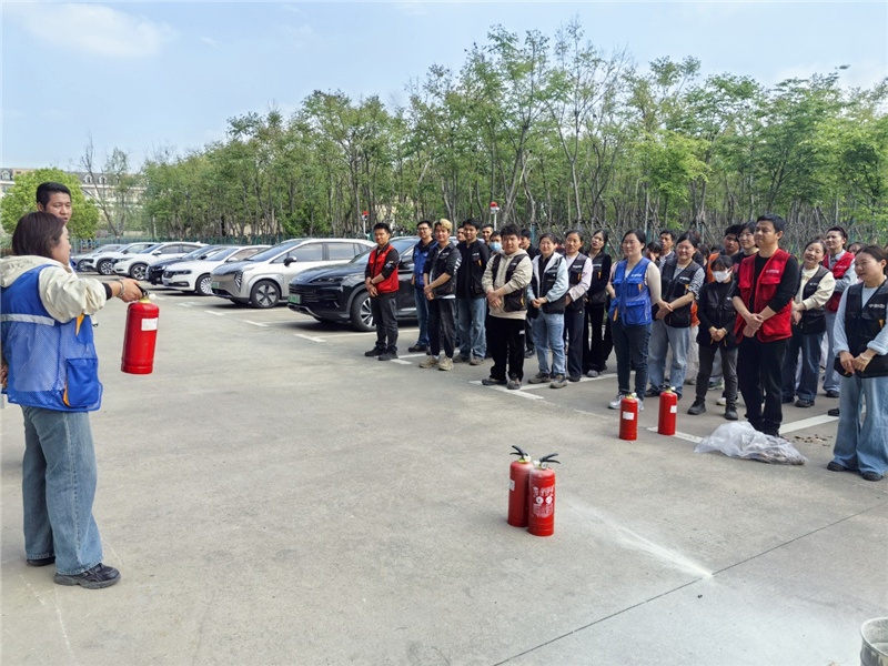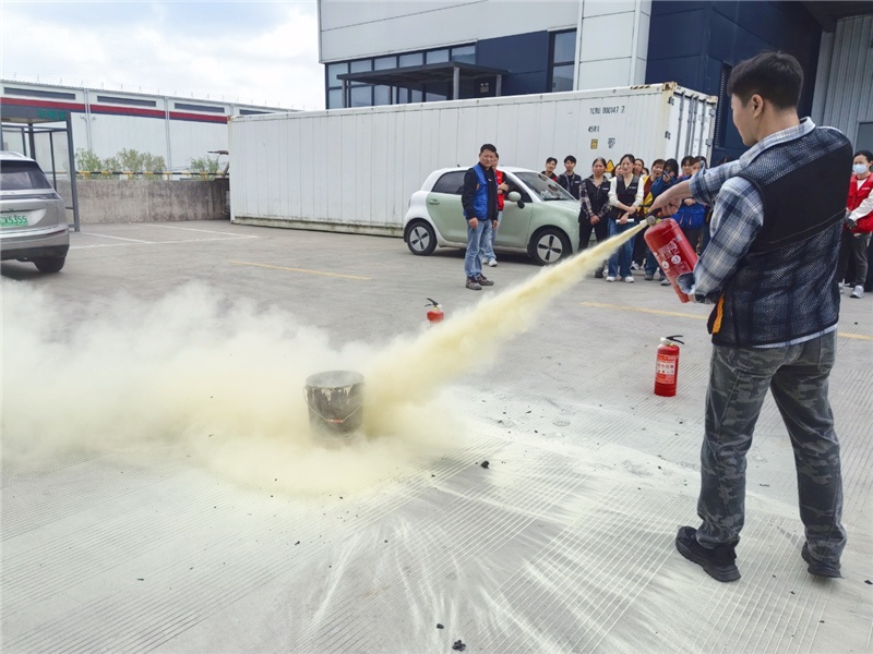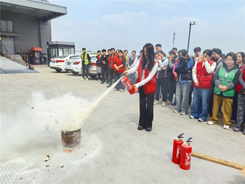 疏散环节结束后,演练进入实操教学阶段。仓经理现场演示灭火器的规范用法——“一提、二拔、三握、四压”,并反复叮嘱“站上风口、对准火焰根部、握紧喷嘴根部”等关键细节。面对燃烧的演练火盆,员工们逐个上前操作,从更初的手忙脚乱到后面的从容应对,灭火技能在亲手体验中真正内化于心。
